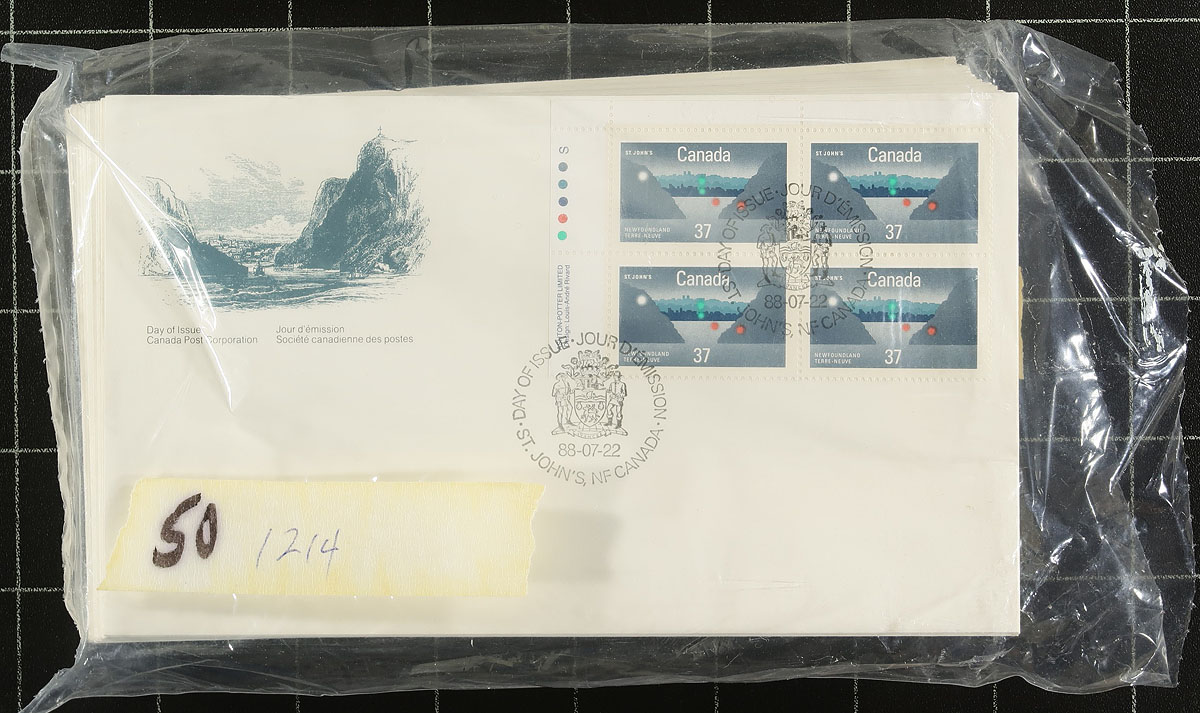 First Day Covers. Bulk lot of Canada first day covers containing 8 different frankings including Unitrade #s 1174 (x41 plate blocks, $6.40 each, counted as singles), 1194A (x39, coil pairs, $3.80 each, counted as singles), 1194A (x50, coil strips, $7.60 each, counted as singles), 1203 (x50, plate blocks, $6 as singles), 1210 (x50, $1.15 each), 1211 (x42, $1.15 each), 1214 (x50 plate blocks, $4.60 each, counted as singles), 2094 (x70, $3 each), 1256 (x50, $1.15 each). The lot contains 442 covers, many still sealed in plastic. A nice bulk lot for dealers with dollar boxes. 2024 Unitrade =