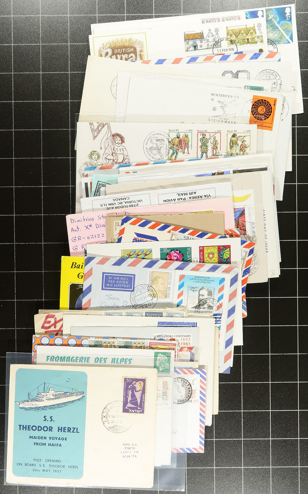 Accumulation of roughly 400 worldwide covers, 1900's-1970's, with a few items on either side of the given range. We note a wide variety of material, mostly first day covers, along with postal stationery, first flight covers, registered mail, postage due covers, book posts, and more, with better representation from European, Africa, and South American countries. A few covers have been priced between $3 to $15 each, leaving better finds to collectors. A few faults noted, overall fine to very fine. Estimate =