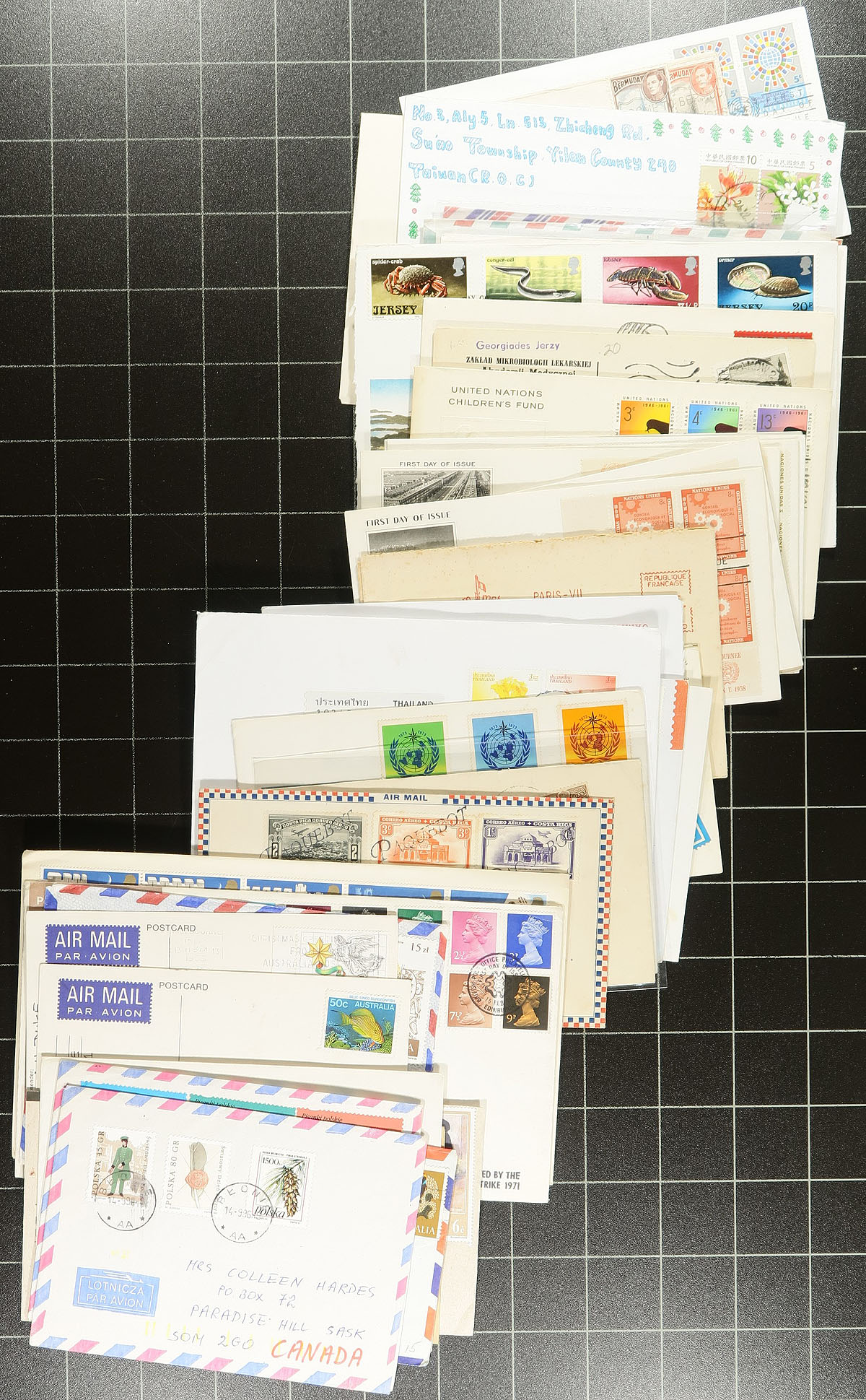 Accumulation of roughly 400 worldwide covers, 1900's-1970's, with a few items on either side of the given range. We note a wide variety of material, mostly first day covers, along with postal stationery, first flight covers, registered mail, postage due covers, book posts, and more, with better representation from European, Africa, and South American countries. A few covers have been priced between $3 to $15 each, leaving better finds to collectors. A few faults noted, overall fine to very fine. Estimate =