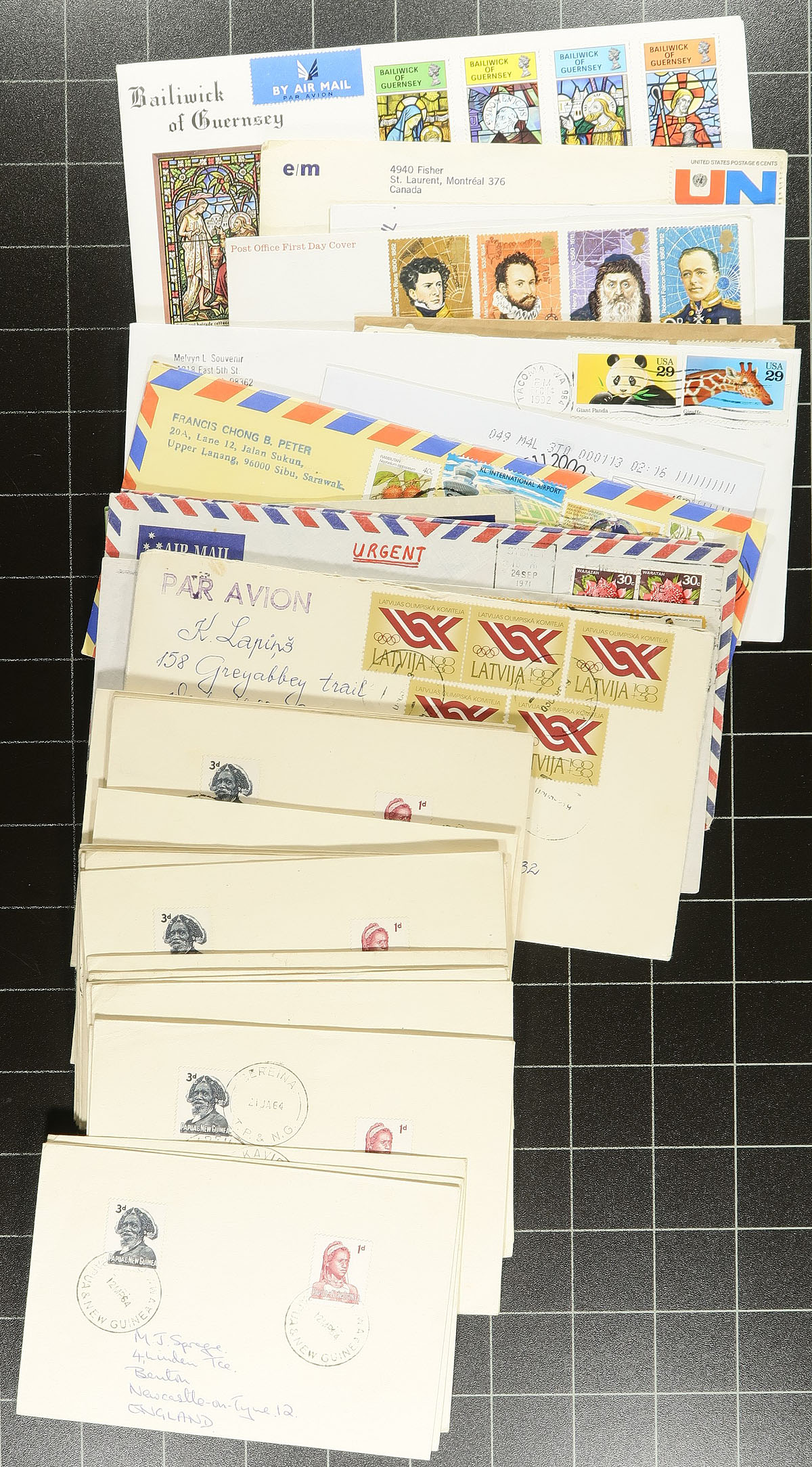 Accumulation of roughly 400 worldwide covers, 1900's-1970's, with a few items on either side of the given range. We note a wide variety of material, mostly first day covers, along with postal stationery, first flight covers, registered mail, postage due covers, book posts, and more, with better representation from European, Africa, and South American countries. A few covers have been priced between $3 to $15 each, leaving better finds to collectors. A few faults noted, overall fine to very fine. Estimate =
