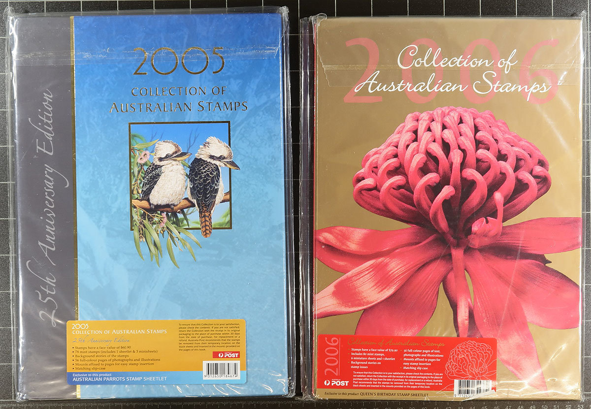 Group of 27 Australia annual collections, complete for the years 1981-2007, filing two bankers boxes, all hardbound and almost all are sealed in original packaging. A high cataloguing lot for collectors, with face value alone totaling AUD$1,169.00 ($1061.21 CDN). Estimate =
