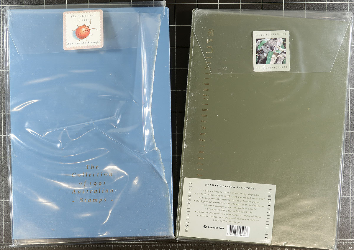 Group of 27 Australia annual collections, complete for the years 1981-2007, filing two bankers boxes, all hardbound and almost all are sealed in original packaging. A high cataloguing lot for collectors, with face value alone totaling AUD$1,169.00 ($1061.21 CDN). Estimate =