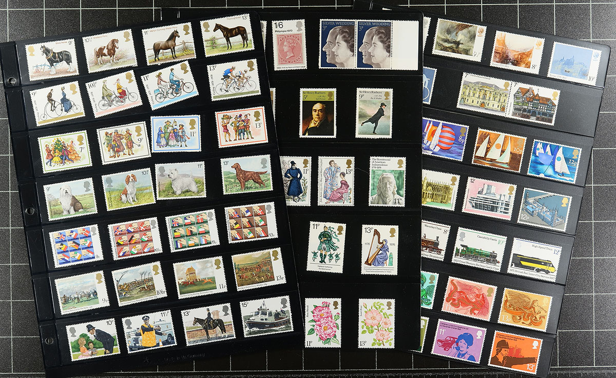 Group of never hinged Great Britain items, 1970's-1990, including 104 presentation packs, along with singles and a few blocks, primarily from the late 1970's to the 1980's. A nice starter group for collectors, with face value alone at £134.00 ($250.55 CDN). A clean lot with a variety of purposes. Estimate =