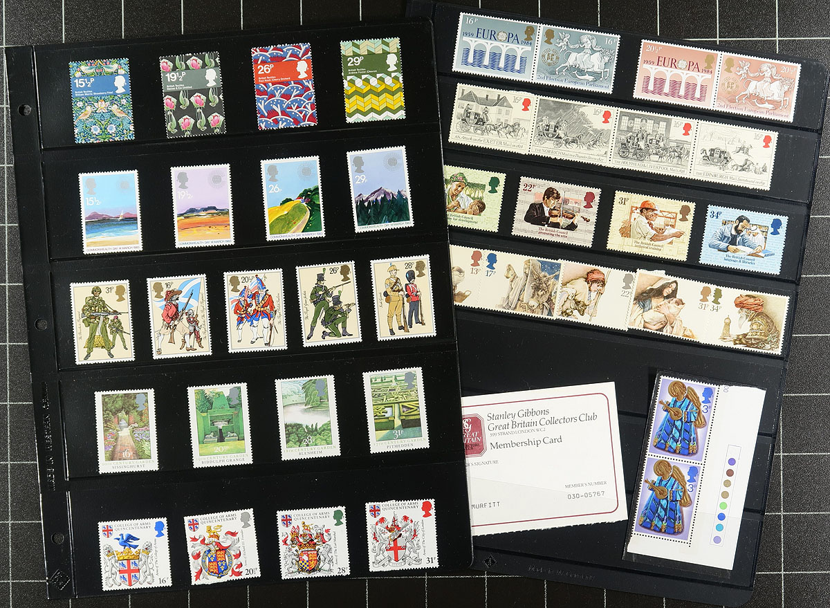 Group of never hinged Great Britain items, 1970's-1990, including 104 presentation packs, along with singles and a few blocks, primarily from the late 1970's to the 1980's. A nice starter group for collectors, with face value alone at £134.00 ($250.55 CDN). A clean lot with a variety of purposes. Estimate =