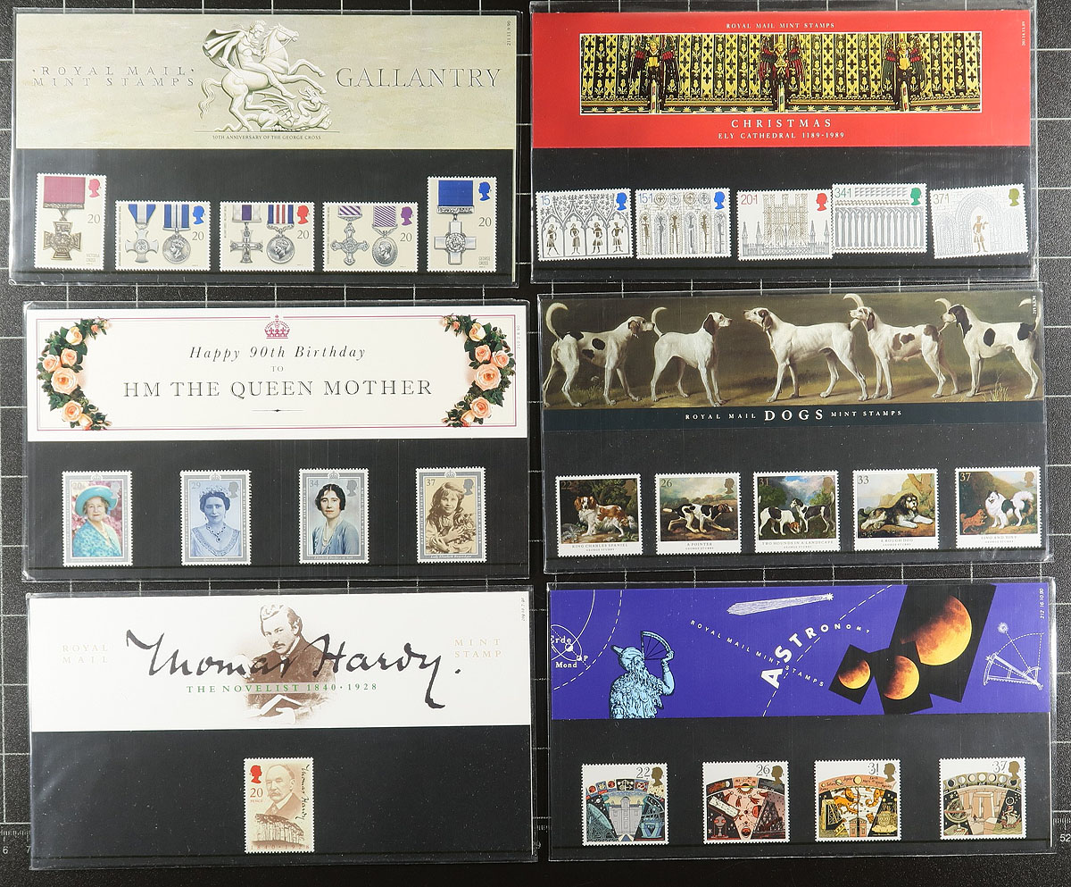 Group of never hinged Great Britain items, 1970's-1990, including 104 presentation packs, along with singles and a few blocks, primarily from the late 1970's to the 1980's. A nice starter group for collectors, with face value alone at £134.00 ($250.55 CDN). A clean lot with a variety of purposes. Estimate =