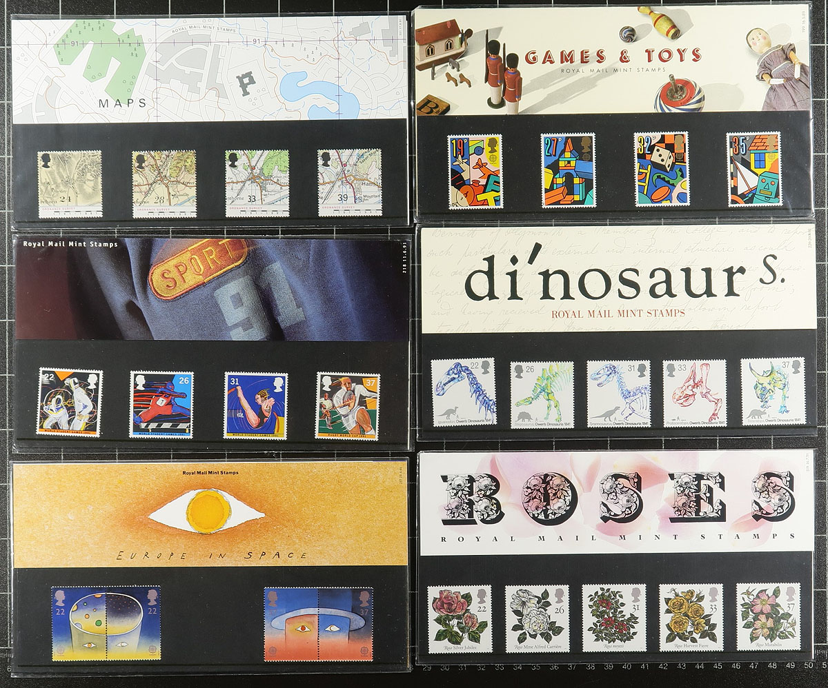 Group of never hinged Great Britain items, 1970's-1990, including 104 presentation packs, along with singles and a few blocks, primarily from the late 1970's to the 1980's. A nice starter group for collectors, with face value alone at £134.00 ($250.55 CDN). A clean lot with a variety of purposes. Estimate =