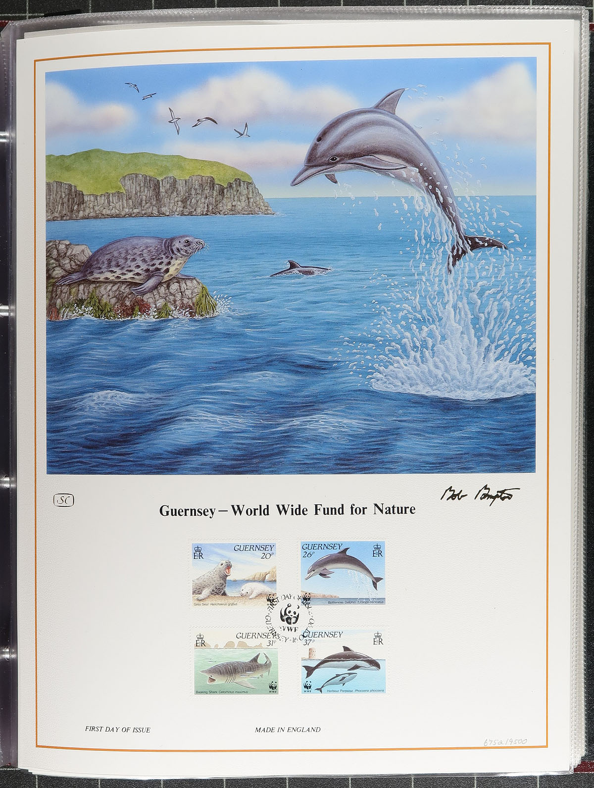 Collection of roughly 350 Great Britain and Channel Islands first day covers in five albums, including 4 albums (roughly 200 items), of limited edition first day lithographs ranging from 1980 to 1991, along with an album containing roughly 150 Great Britain covers from the 1970's to the 1980's. A nice grouping for cover collectors. Estimate =