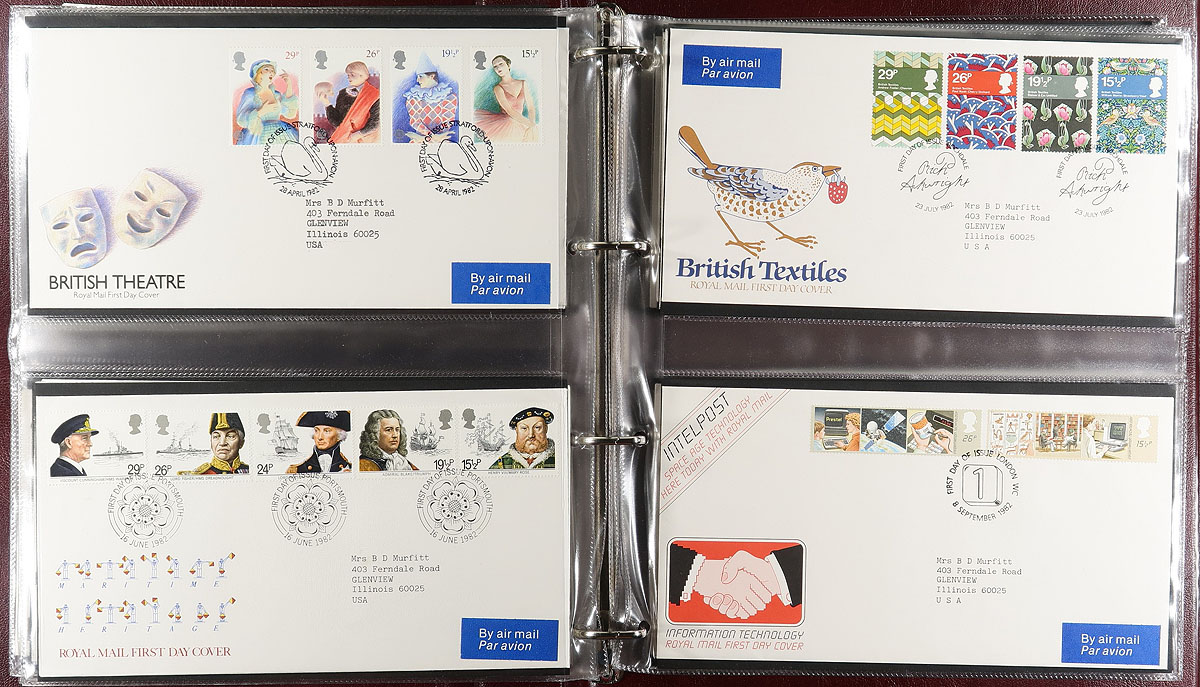 Collection of roughly 350 Great Britain and Channel Islands first day covers in five albums, including 4 albums (roughly 200 items), of limited edition first day lithographs ranging from 1980 to 1991, along with an album containing roughly 150 Great Britain covers from the 1970's to the 1980's. A nice grouping for cover collectors. Estimate =