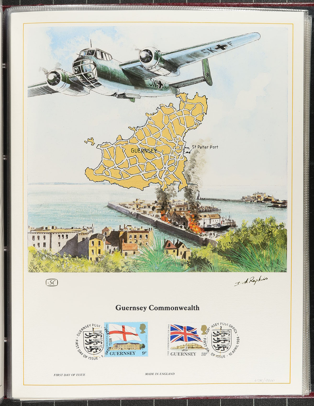 Collection of roughly 350 Great Britain and Channel Islands first day covers in five albums, including 4 albums (roughly 200 items), of limited edition first day lithographs ranging from 1980 to 1991, along with an album containing roughly 150 Great Britain covers from the 1970's to the 1980's. A nice grouping for cover collectors. Estimate =