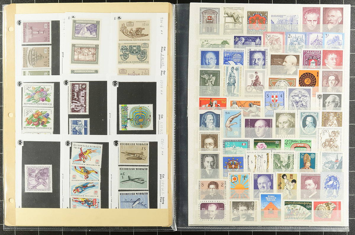Collection / accumulation of mint Austria, 1920's-1990, containing over 1,000 stamps in roughly 15 stock pages. The lot generally ranges from Scott #459/1524, along with selections of semi-postal issues, with a spot check indicated a few singles, sets, and partial sets, cataloguing $10 and up, including #s 536, 538, 556 (mh, c.v. $175 total). Owner's older Scott catalogue value for the lot totals US$886.00 ($1196.10 CDN). Duplication up to 4 in a few cases. A clean lot for collectors and dealers looking for stock. Estimate =