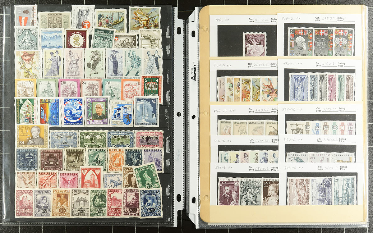 Collection / accumulation of mint Austria, 1920's-1990, containing over 1,000 stamps in roughly 15 stock pages. The lot generally ranges from Scott #459/1524, along with selections of semi-postal issues, with a spot check indicated a few singles, sets, and partial sets, cataloguing $10 and up, including #s 536, 538, 556 (mh, c.v. $175 total). Owner's older Scott catalogue value for the lot totals US$886.00 ($1196.10 CDN). Duplication up to 4 in a few cases. A clean lot for collectors and dealers looking for stock. Estimate =