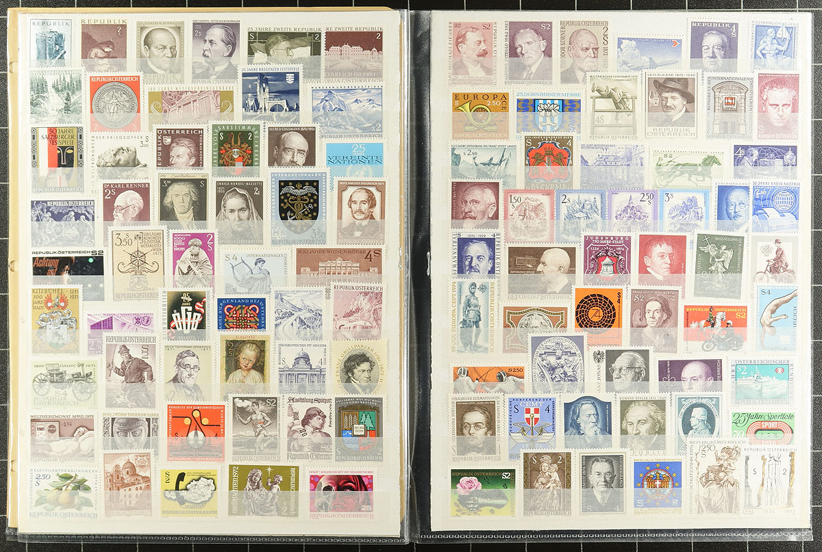 Collection / accumulation of mint Austria, 1920's-1990, containing over 1,000 stamps in roughly 15 stock pages. The lot generally ranges from Scott #459/1524, along with selections of semi-postal issues, with a spot check indicated a few singles, sets, and partial sets, cataloguing $10 and up, including #s 536, 538, 556 (mh, c.v. $175 total). Owner's older Scott catalogue value for the lot totals US$886.00 ($1196.10 CDN). Duplication up to 4 in a few cases. A clean lot for collectors and dealers looking for stock. Estimate =