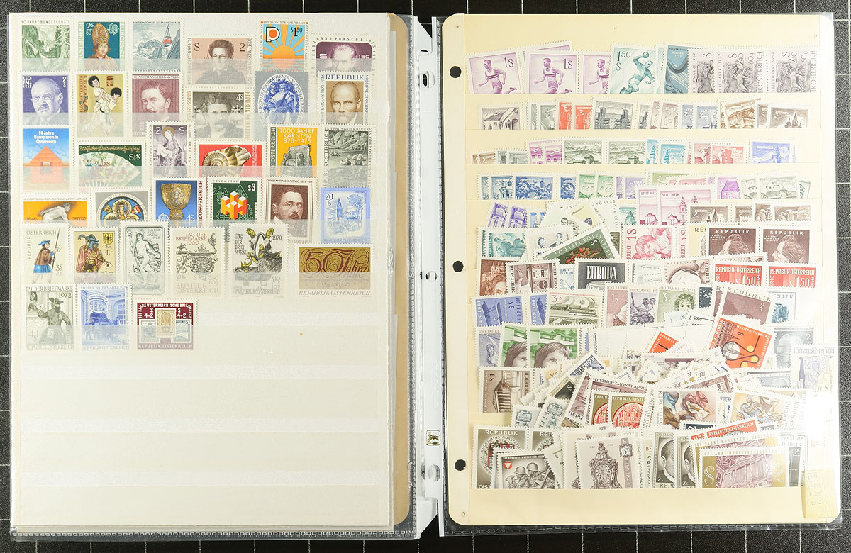 Collection / accumulation of mint Austria, 1920's-1990, containing over 1,000 stamps in roughly 15 stock pages. The lot generally ranges from Scott #459/1524, along with selections of semi-postal issues, with a spot check indicated a few singles, sets, and partial sets, cataloguing $10 and up, including #s 536, 538, 556 (mh, c.v. $175 total). Owner's older Scott catalogue value for the lot totals US$886.00 ($1196.10 CDN). Duplication up to 4 in a few cases. A clean lot for collectors and dealers looking for stock. Estimate =