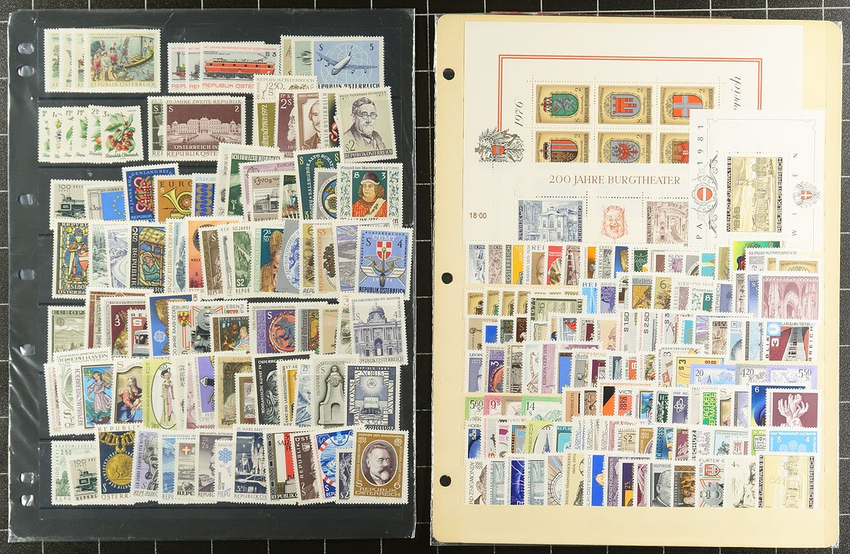 Collection / accumulation of mint Austria, 1920's-1990, containing over 1,000 stamps in roughly 15 stock pages. The lot generally ranges from Scott #459/1524, along with selections of semi-postal issues, with a spot check indicated a few singles, sets, and partial sets, cataloguing $10 and up, including #s 536, 538, 556 (mh, c.v. $175 total). Owner's older Scott catalogue value for the lot totals US$886.00 ($1196.10 CDN). Duplication up to 4 in a few cases. A clean lot for collectors and dealers looking for stock. Estimate =