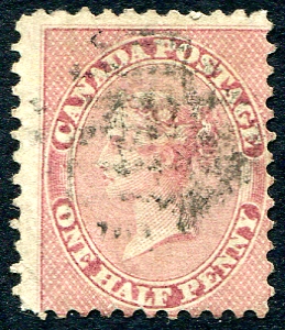 Fine appearing used example of the 1858 issue half-penny rose perforated pence issue, with light grid postmark. A pressed out crease, but still presents well and is missing from most collections we see. 2025 Scott US$1,500.00 =