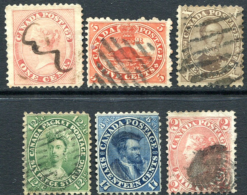 Attractive used offering of 5x 1859 "First Cents" issues, plus the 1864 QV issue 2c rose, neatly arranged on a stockcard. Some pretty stamps here, with all stamps being sound, with only the odd small perf fault. A group generally in better condition than usually seen. The 1c in particular is a huge JUMBO example. Catalogued as the cheapest listing of each stamp. 2025 Scott US$1,027.50 =