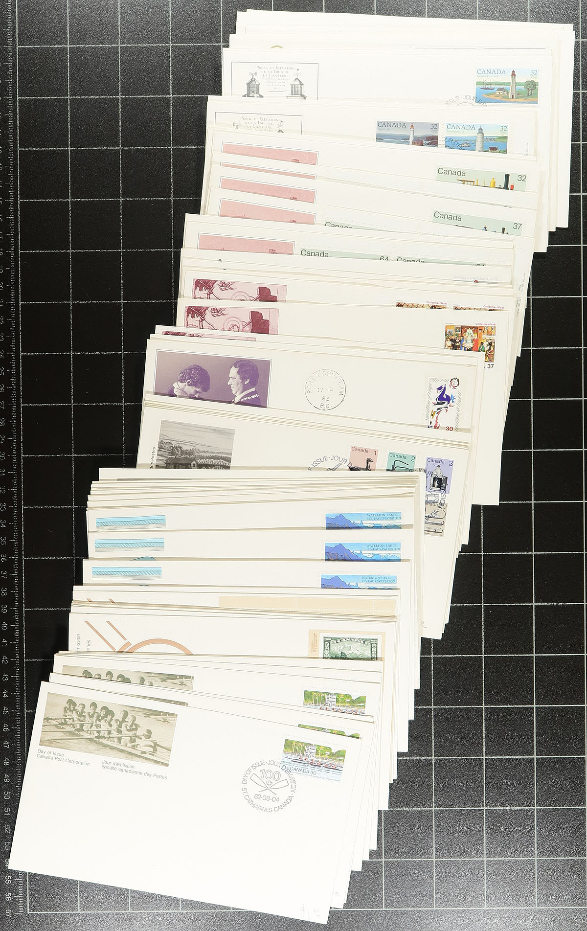 First Day Covers. Collection / accumulation of roughly 500 first day covers, 1970's-1990's, noting singles, sets, blocks, plate blocks, joint issues, booklets, coil strips, and high denomination frankings. Just a few of the better items include Unitrade #1183 plate block (UR, plate 1), 1250ii Regiments plate block (c.v. $125), and much more. A nice lot for the first day cover collector. Estimate =