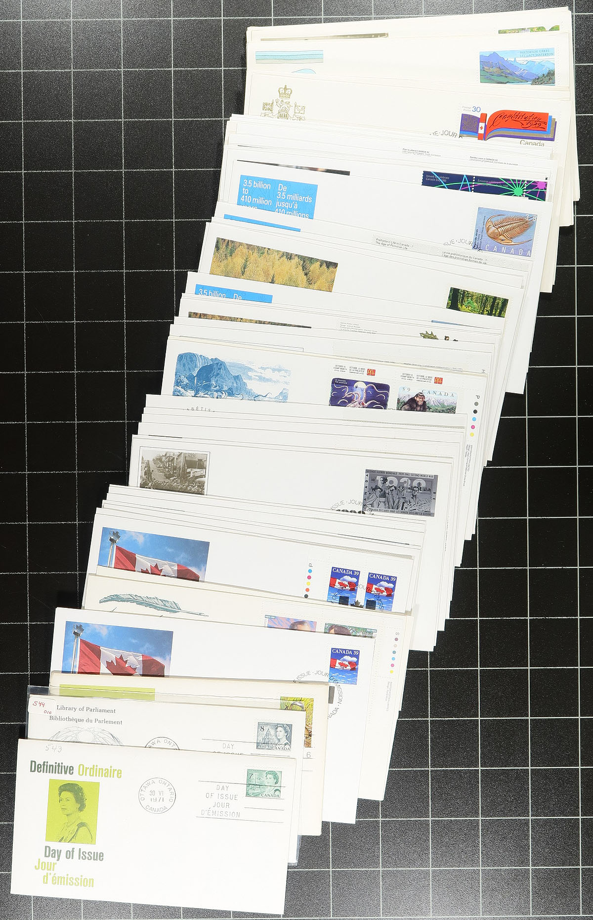 First Day Covers. Collection / accumulation of roughly 500 first day covers, 1970's-1990's, noting singles, sets, blocks, plate blocks, joint issues, booklets, coil strips, and high denomination frankings. Just a few of the better items include Unitrade #1183 plate block (UR, plate 1), 1250ii Regiments plate block (c.v. $125), and much more. A nice lot for the first day cover collector. Estimate =