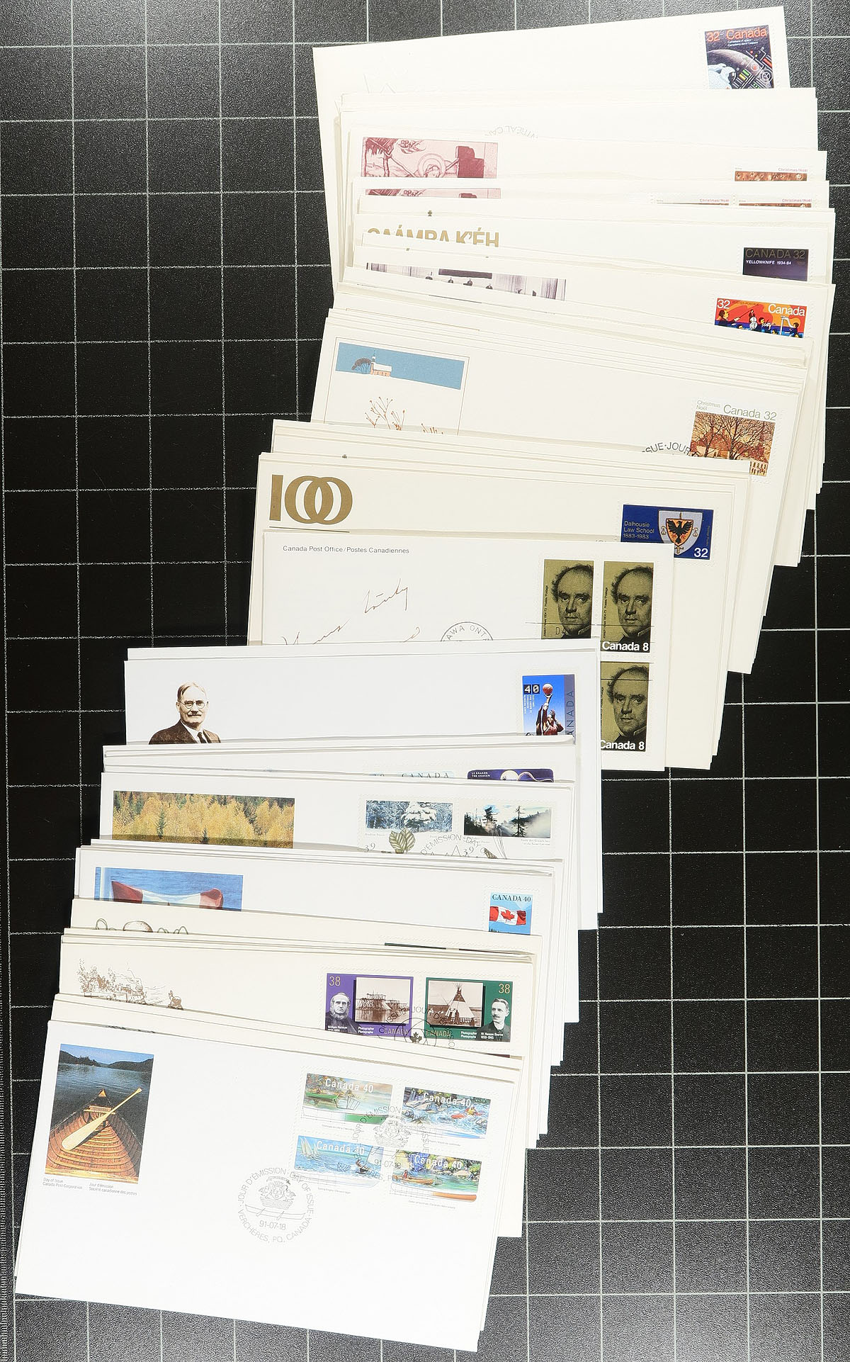 First Day Covers. Collection / accumulation of roughly 500 first day covers, 1970's-1990's, noting singles, sets, blocks, plate blocks, joint issues, booklets, coil strips, and high denomination frankings. Just a few of the better items include Unitrade #1183 plate block (UR, plate 1), 1250ii Regiments plate block (c.v. $125), and much more. A nice lot for the first day cover collector. Estimate =
