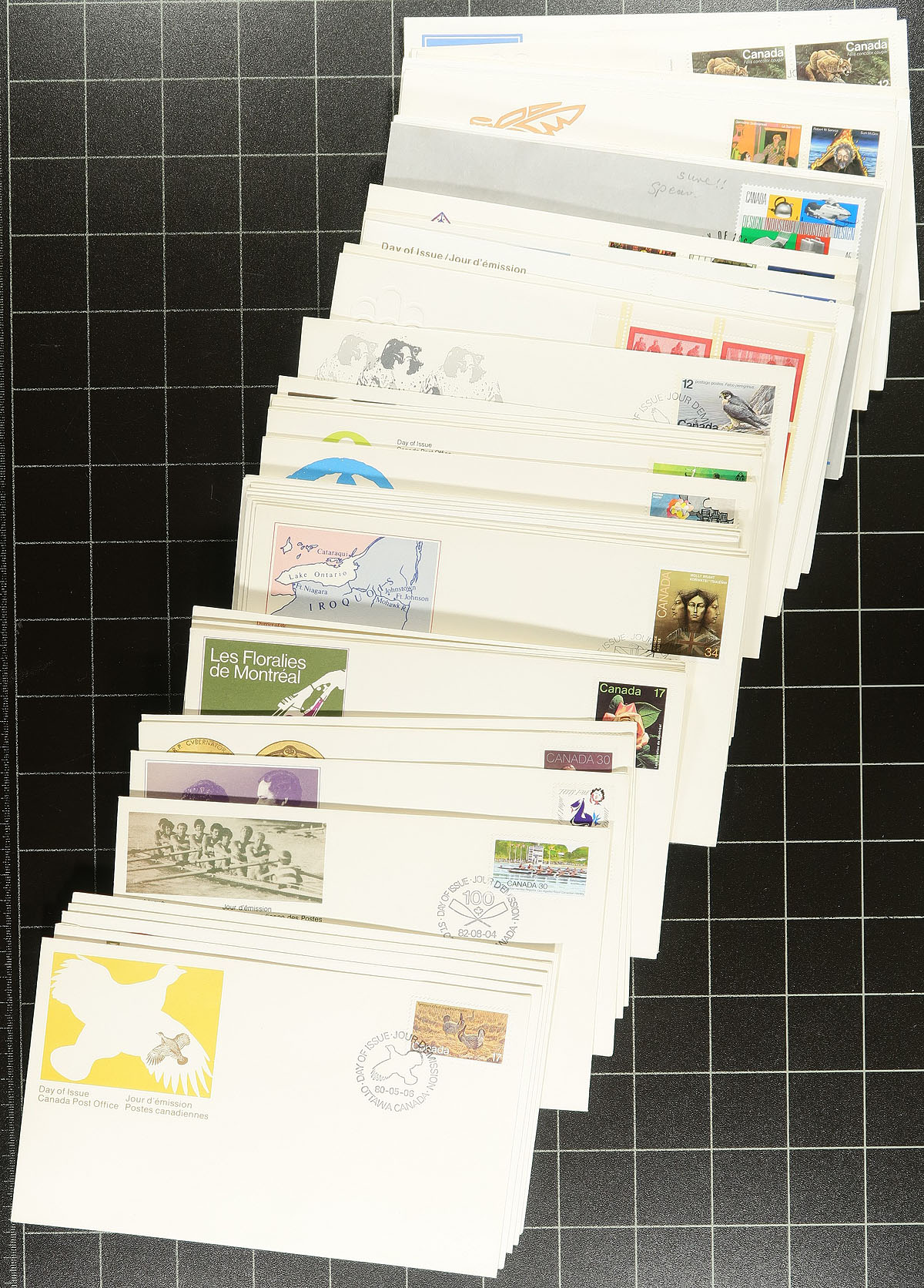 First Day Cover collection of roughly 500 first day covers in filling a shoe box, 1977-1998, with covers possible on either side of the given range. We note singles, sets, coils, souvenir sheets, many plate blocks, and a few high denomination frankings. A spot check indicated some covers cataloguing $10 and up, making this a nice lot for collectors and dealers alike. Overall fine to very fine. Estimate =