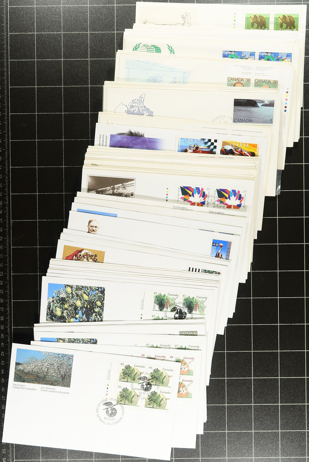 First Day Cover collection of roughly 500 first day covers in filling a shoe box, 1977-1998, with covers possible on either side of the given range. We note singles, sets, coils, souvenir sheets, many plate blocks, and a few high denomination frankings. A spot check indicated some covers cataloguing $10 and up, making this a nice lot for collectors and dealers alike. Overall fine to very fine. Estimate =