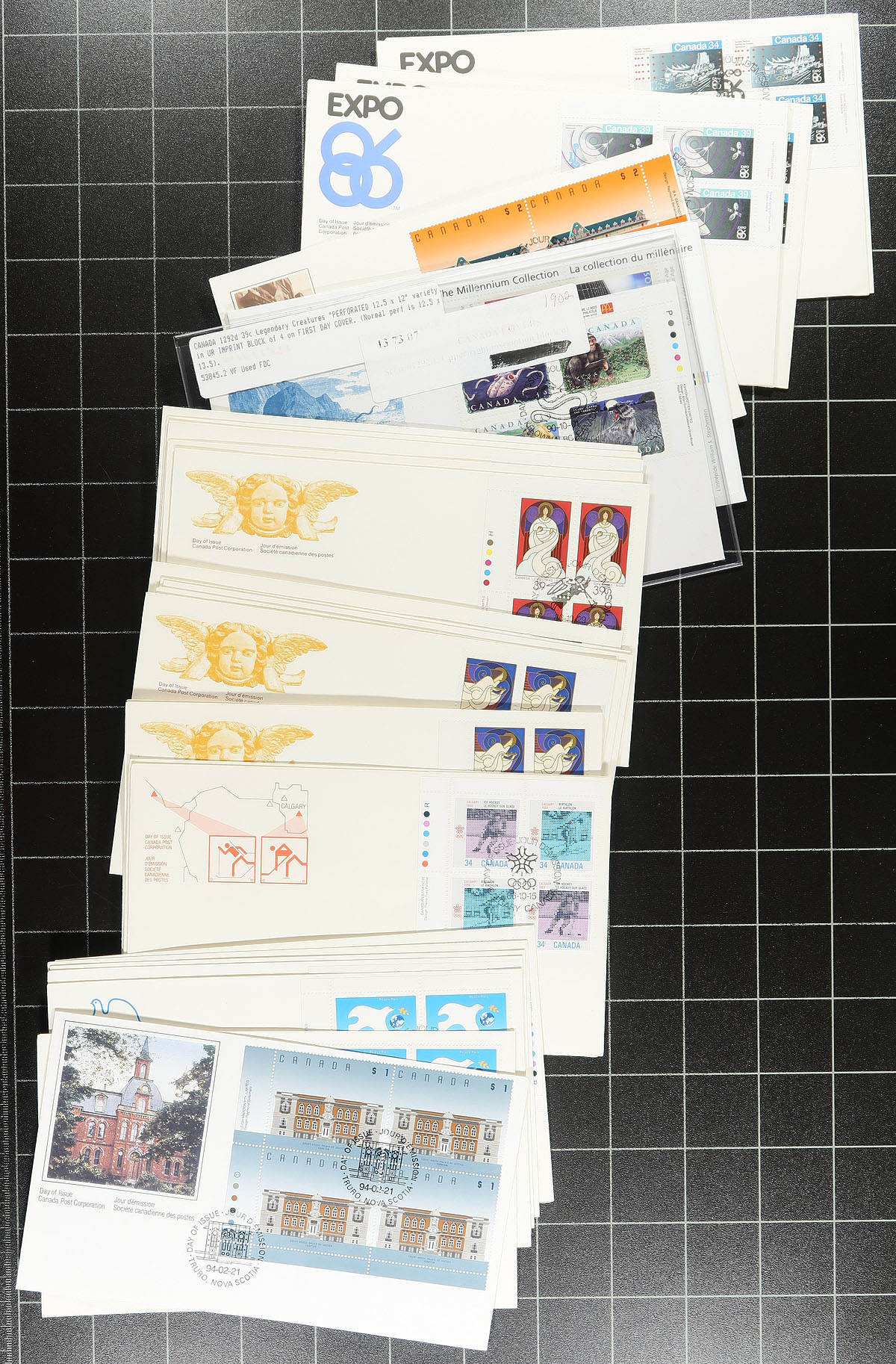 First Day Covers. Group of roughly 500 first day covers collected for plate block frankings, 1970s-1990s, includes a few matched sets for some issues, also noted Unitrade #1292d Legendary Creatures 12.5 x 12 perforation plate block (c.v. $50), along with a few high denomination plate blocks. A few covers have toning spots, otherwise a fine to very fine lot for the plate block or first day cover collector. Estimate =
