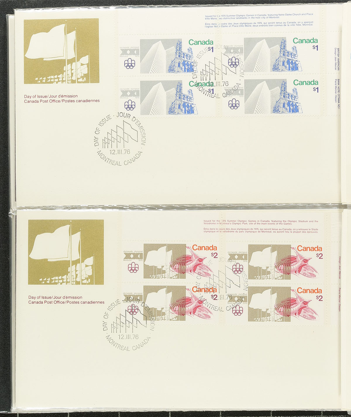 First Day Covers. Group of roughly 400 first day covers, 1975-1999, neatly organized in 4 cover albums, noting singles, sets, booklet pane, coil, souvenir sheet, several plate blocks, and high denomination frankings. A spot check indicated a few covers cataloguing $10 and up, including #1250ii Regiments plate block (c.v. $125). A nice clean collection for all collectors. Estimate =