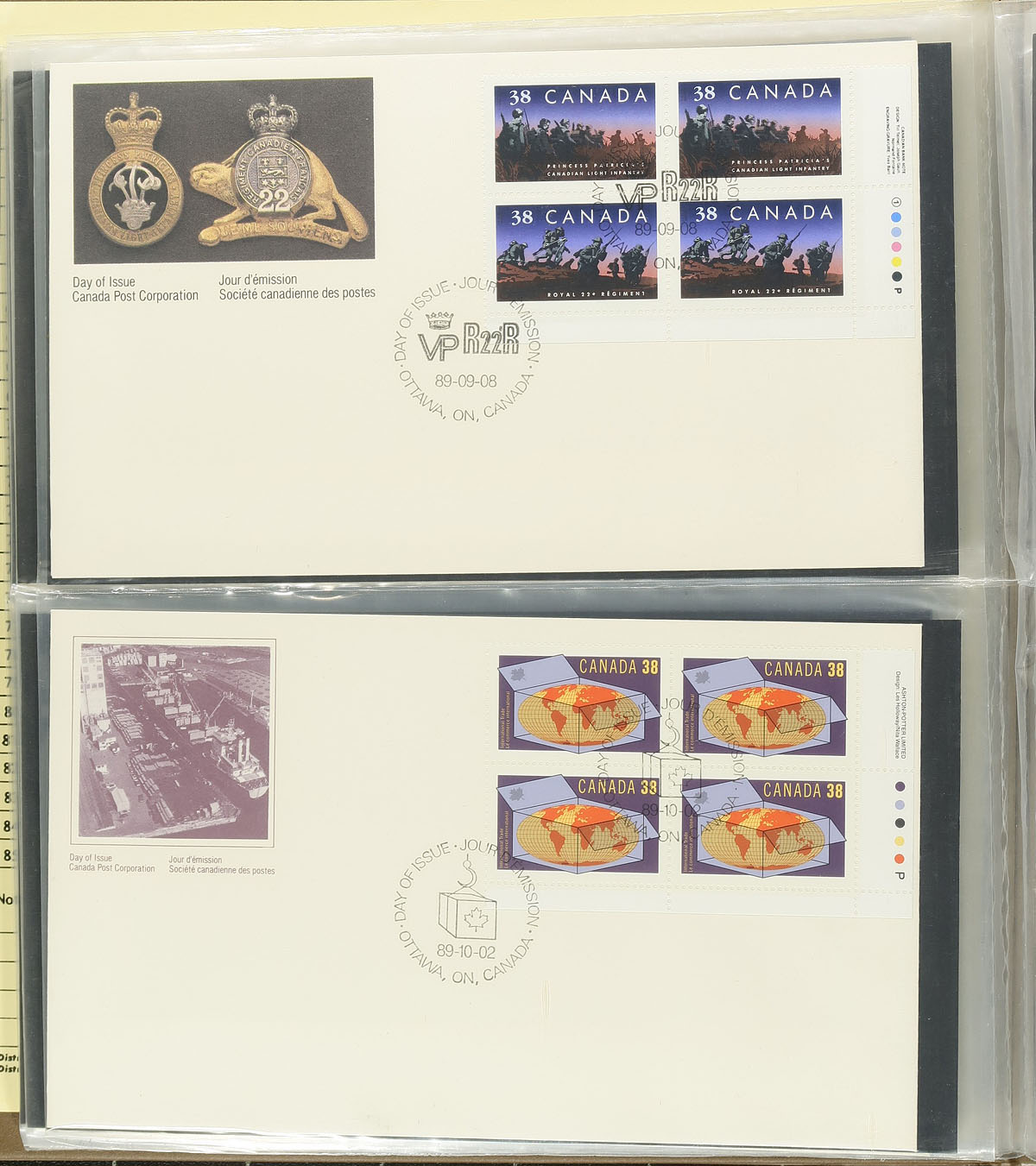First Day Covers. Group of roughly 400 first day covers, 1975-1999, neatly organized in 4 cover albums, noting singles, sets, booklet pane, coil, souvenir sheet, several plate blocks, and high denomination frankings. A spot check indicated a few covers cataloguing $10 and up, including #1250ii Regiments plate block (c.v. $125). A nice clean collection for all collectors. Estimate =
