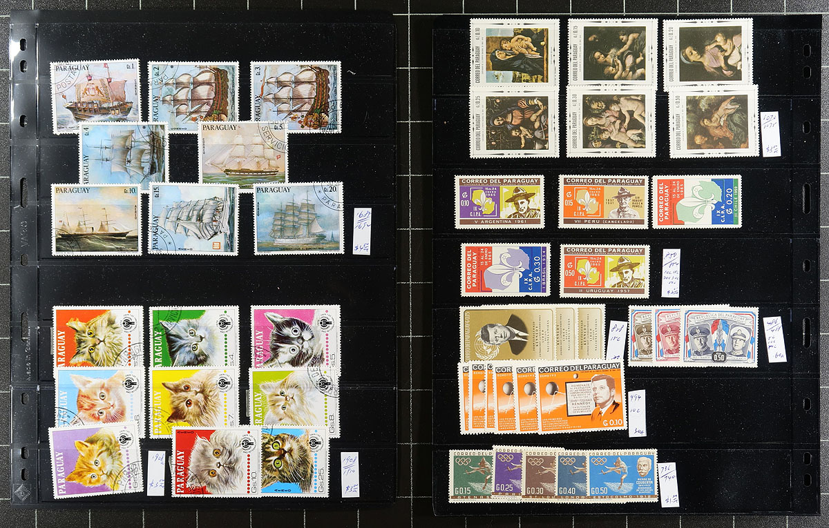 South / Central America. Collections / accumulation of mint and used Central and South America material, 1890's-1990's, with over 1,000 stamps in roughly 30 stock pages. A spot check indicated better representation from Paraguay, Brazil, Argentina, Bolivia, and more, noting singles, sets, partial sets, officials, and other back of the book material. Owner's older 2015 Scott US$1,259.00 =
