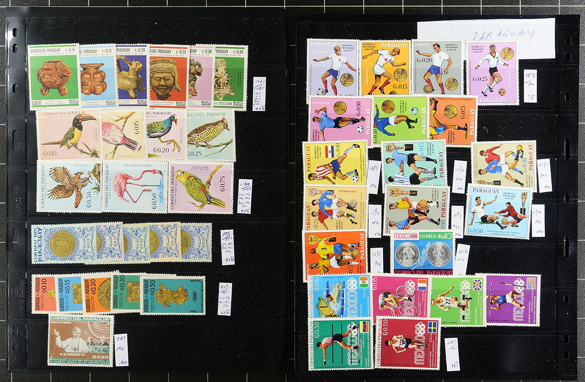South / Central America. Collections / accumulation of mint and used Central and South America material, 1890's-1990's, with over 1,000 stamps in roughly 30 stock pages. A spot check indicated better representation from Paraguay, Brazil, Argentina, Bolivia, and more, noting singles, sets, partial sets, officials, and other back of the book material. Owner's older 2015 Scott US$1,259.00 =