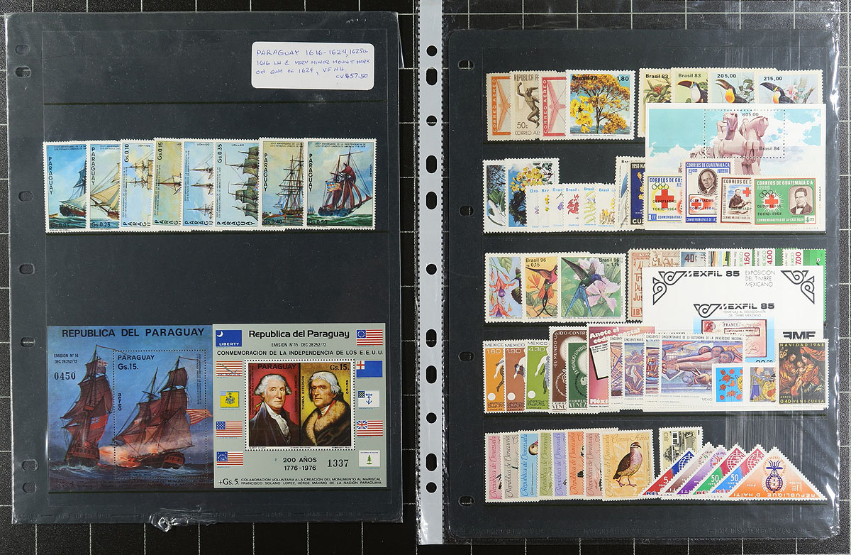 South / Central America. Collections / accumulation of mint and used Central and South America material, 1890's-1990's, with over 1,000 stamps in roughly 30 stock pages. A spot check indicated better representation from Paraguay, Brazil, Argentina, Bolivia, and more, noting singles, sets, partial sets, officials, and other back of the book material. Owner's older 2015 Scott US$1,259.00 =