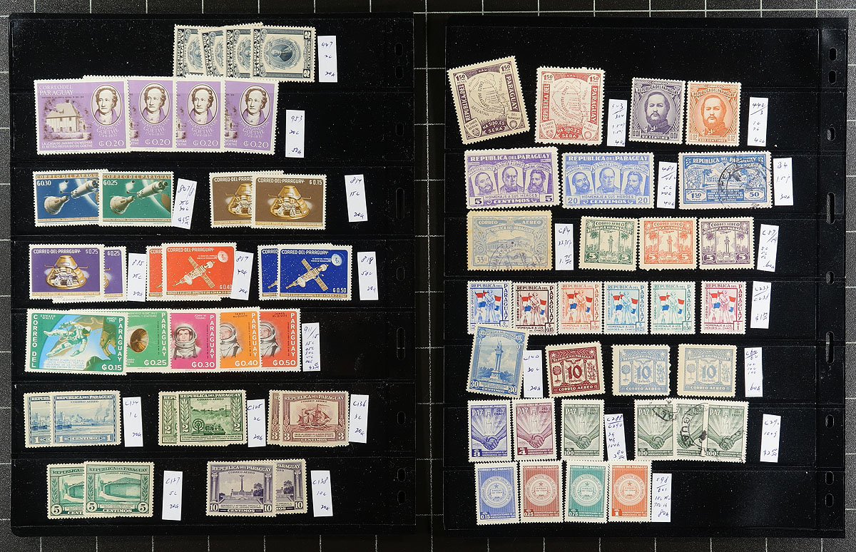 South / Central America. Collections / accumulation of mint and used Central and South America material, 1890's-1990's, with over 1,000 stamps in roughly 30 stock pages. A spot check indicated better representation from Paraguay, Brazil, Argentina, Bolivia, and more, noting singles, sets, partial sets, officials, and other back of the book material. Owner's older 2015 Scott US$1,259.00 =