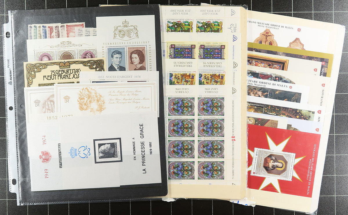 Accumulation of many hundreds of primarily never hinged souvenir sheets, 1960's-1980's, in album or stock pages, and in dealer approval pages. A spot check indicated material from South America, Europe, and African countries, with better representation from Austria, Vatican City, Ireland, just to name a few. Many of the items have been priced retailing in the $5 to $15 range each. A nice lot for all collectors, also encountering several suitable topical and thematic subjects. Estimate =