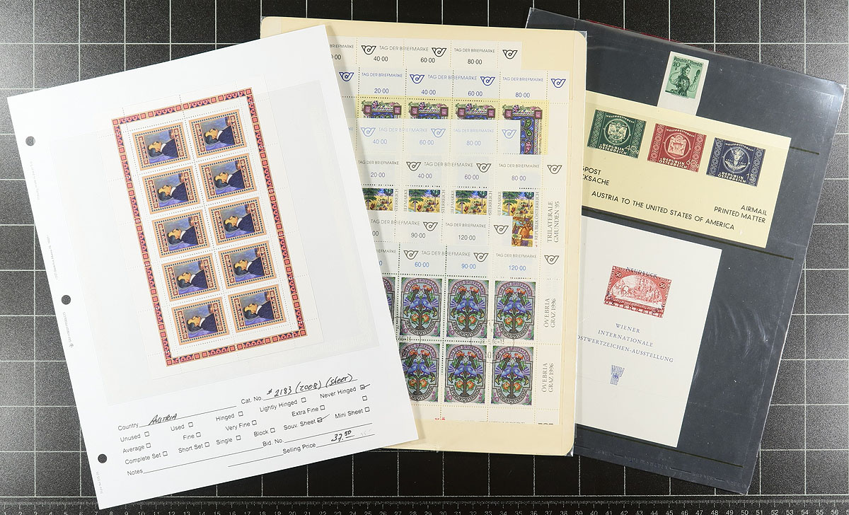 Accumulation of many hundreds of primarily never hinged souvenir sheets, 1960's-1980's, in album or stock pages, and in dealer approval pages. A spot check indicated material from South America, Europe, and African countries, with better representation from Austria, Vatican City, Ireland, just to name a few. Many of the items have been priced retailing in the $5 to $15 range each. A nice lot for all collectors, also encountering several suitable topical and thematic subjects. Estimate =