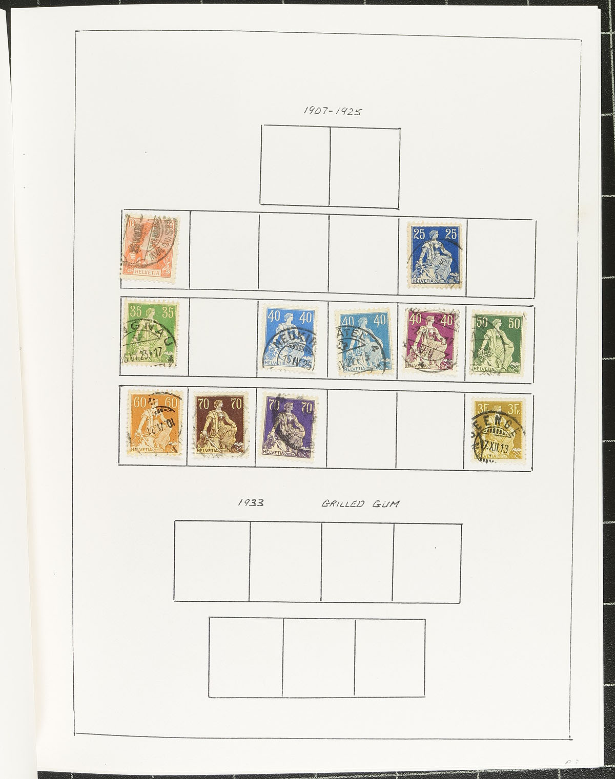 Collection of used Switzerland, 1862-1939, containing a few hundred stamps on roughly 30 homemade album pages. The collection is generally well organized, with each stamp identified by the collector, ranging from Scott #43/255, noting singles, sets, and partial sets, with a spot check indicated some material cataloguing $10 to $20 each. Owner's 2014 Scott catalogue value for the collection totals US$778.00. A nice collection with some duplication for a few issues, a faults with a few stamps, overall fine to very fine. Estimate =