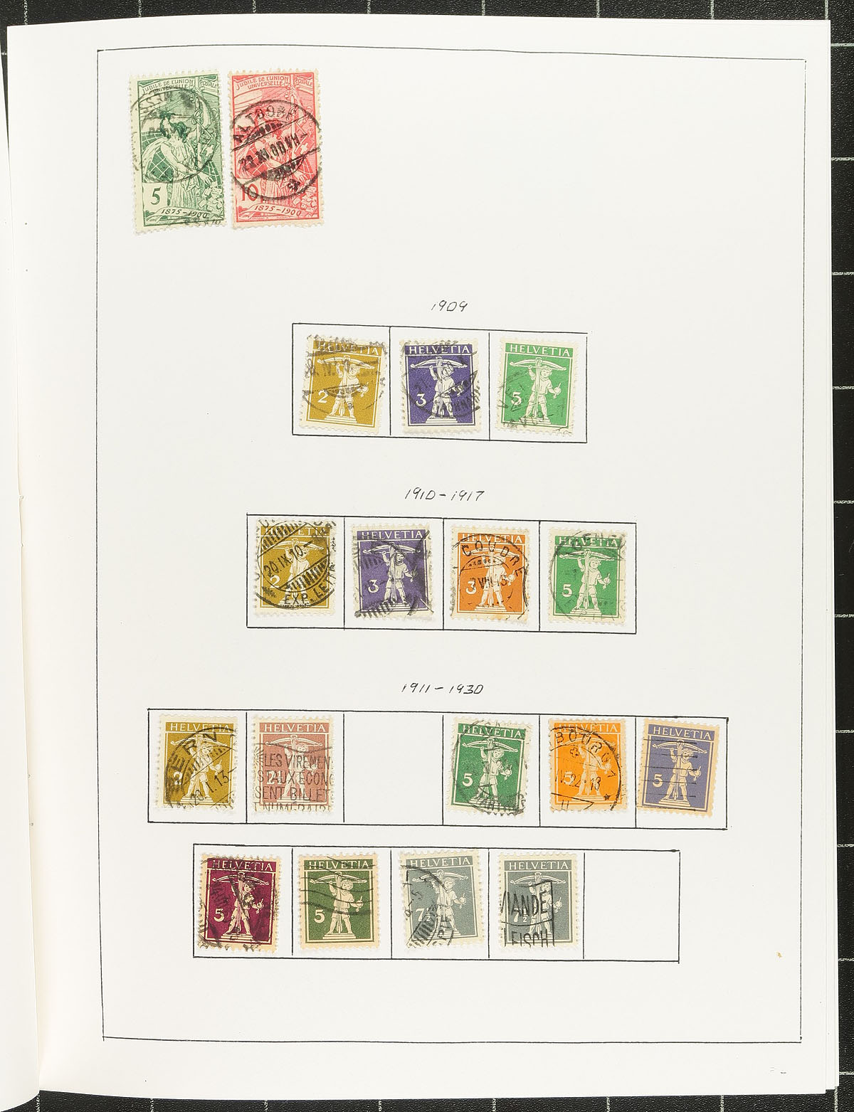 Collection of used Switzerland, 1862-1939, containing a few hundred stamps on roughly 30 homemade album pages. The collection is generally well organized, with each stamp identified by the collector, ranging from Scott #43/255, noting singles, sets, and partial sets, with a spot check indicated some material cataloguing $10 to $20 each. Owner's 2014 Scott catalogue value for the collection totals US$778.00. A nice collection with some duplication for a few issues, a faults with a few stamps, overall fine to very fine. Estimate =