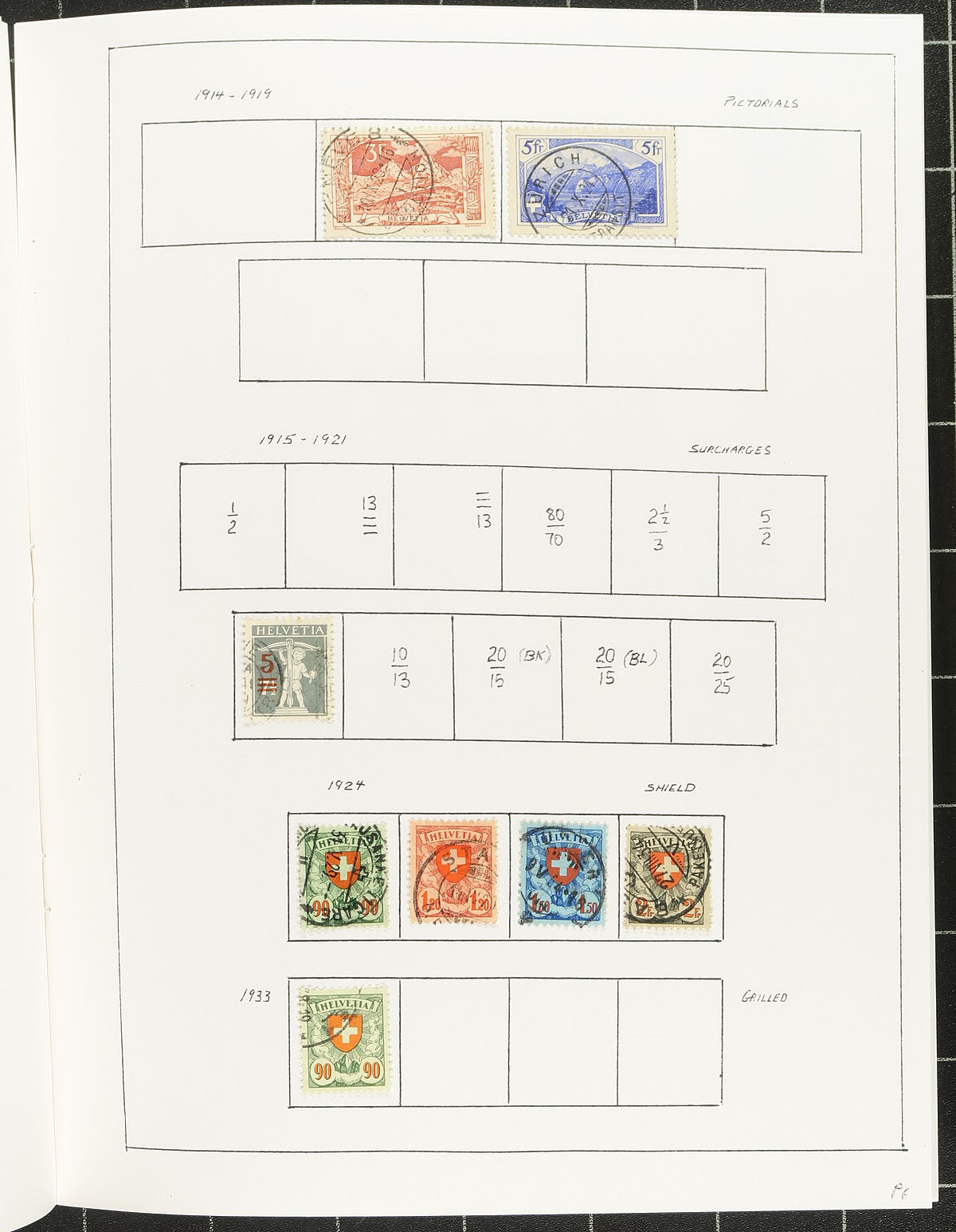 Collection of used Switzerland, 1862-1939, containing a few hundred stamps on roughly 30 homemade album pages. The collection is generally well organized, with each stamp identified by the collector, ranging from Scott #43/255, noting singles, sets, and partial sets, with a spot check indicated some material cataloguing $10 to $20 each. Owner's 2014 Scott catalogue value for the collection totals US$778.00. A nice collection with some duplication for a few issues, a faults with a few stamps, overall fine to very fine. Estimate =