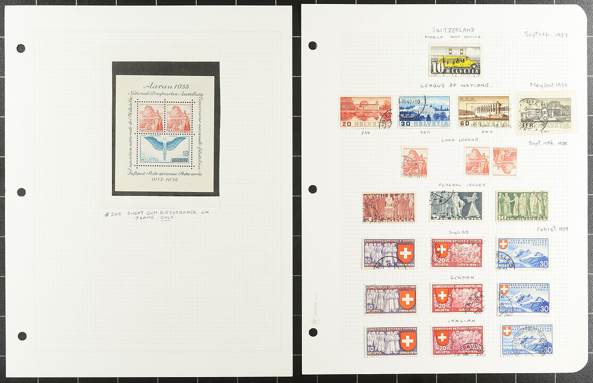 Collection of used Switzerland, 1862-1939, containing a few hundred stamps on roughly 30 homemade album pages. The collection is generally well organized, with each stamp identified by the collector, ranging from Scott #43/255, noting singles, sets, and partial sets, with a spot check indicated some material cataloguing $10 to $20 each. Owner's 2014 Scott catalogue value for the collection totals US$778.00. A nice collection with some duplication for a few issues, a faults with a few stamps, overall fine to very fine. Estimate =