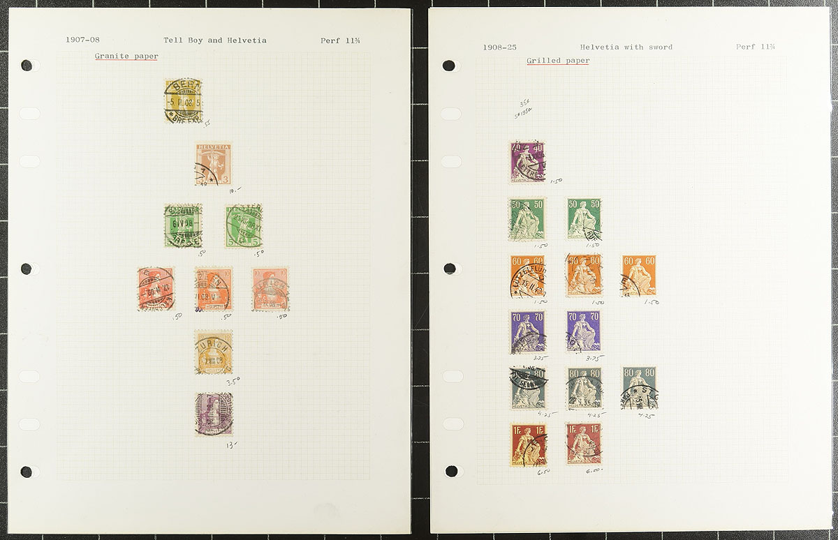 Collection of used Switzerland, 1862-1939, containing a few hundred stamps on roughly 30 homemade album pages. The collection is generally well organized, with each stamp identified by the collector, ranging from Scott #43/255, noting singles, sets, and partial sets, with a spot check indicated some material cataloguing $10 to $20 each. Owner's 2014 Scott catalogue value for the collection totals US$778.00. A nice collection with some duplication for a few issues, a faults with a few stamps, overall fine to very fine. Estimate =