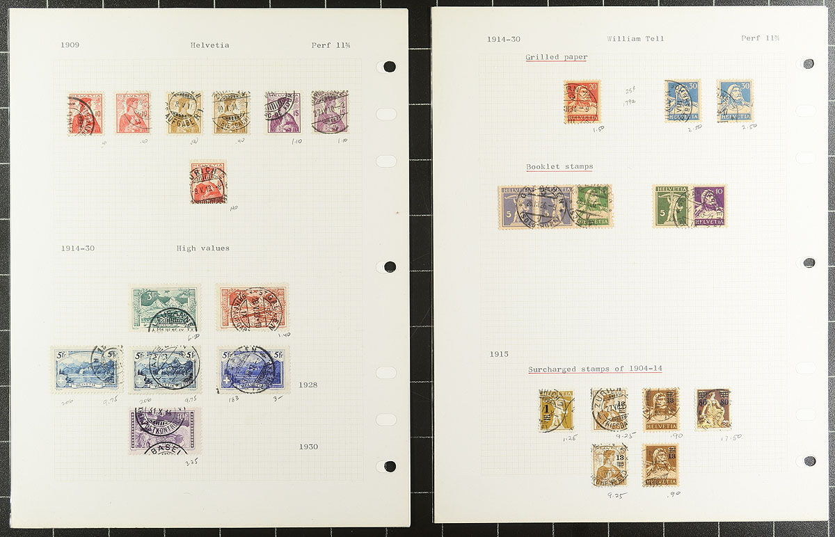 Collection of used Switzerland, 1862-1939, containing a few hundred stamps on roughly 30 homemade album pages. The collection is generally well organized, with each stamp identified by the collector, ranging from Scott #43/255, noting singles, sets, and partial sets, with a spot check indicated some material cataloguing $10 to $20 each. Owner's 2014 Scott catalogue value for the collection totals US$778.00. A nice collection with some duplication for a few issues, a faults with a few stamps, overall fine to very fine. Estimate =