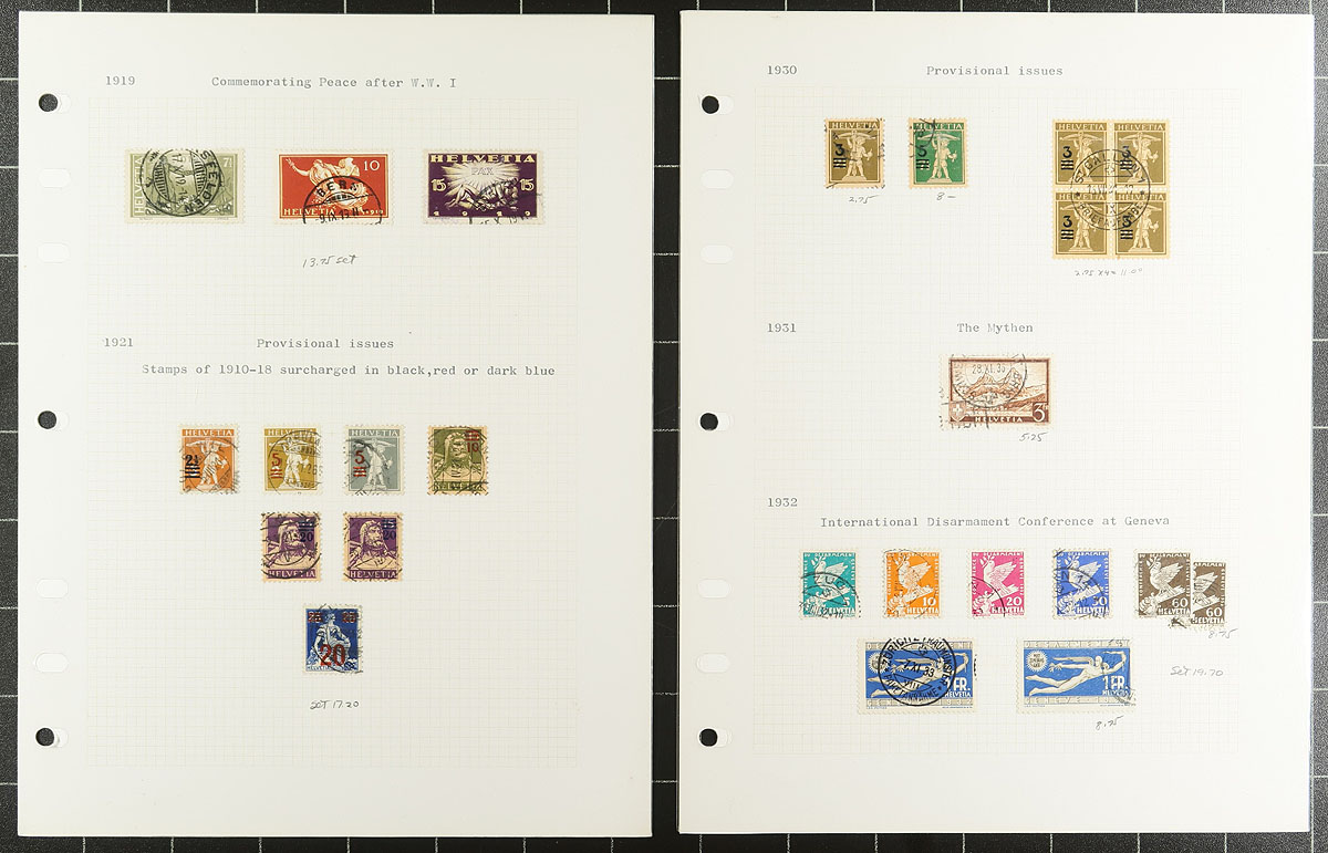 Collection of used Switzerland, 1862-1939, containing a few hundred stamps on roughly 30 homemade album pages. The collection is generally well organized, with each stamp identified by the collector, ranging from Scott #43/255, noting singles, sets, and partial sets, with a spot check indicated some material cataloguing $10 to $20 each. Owner's 2014 Scott catalogue value for the collection totals US$778.00. A nice collection with some duplication for a few issues, a faults with a few stamps, overall fine to very fine. Estimate =