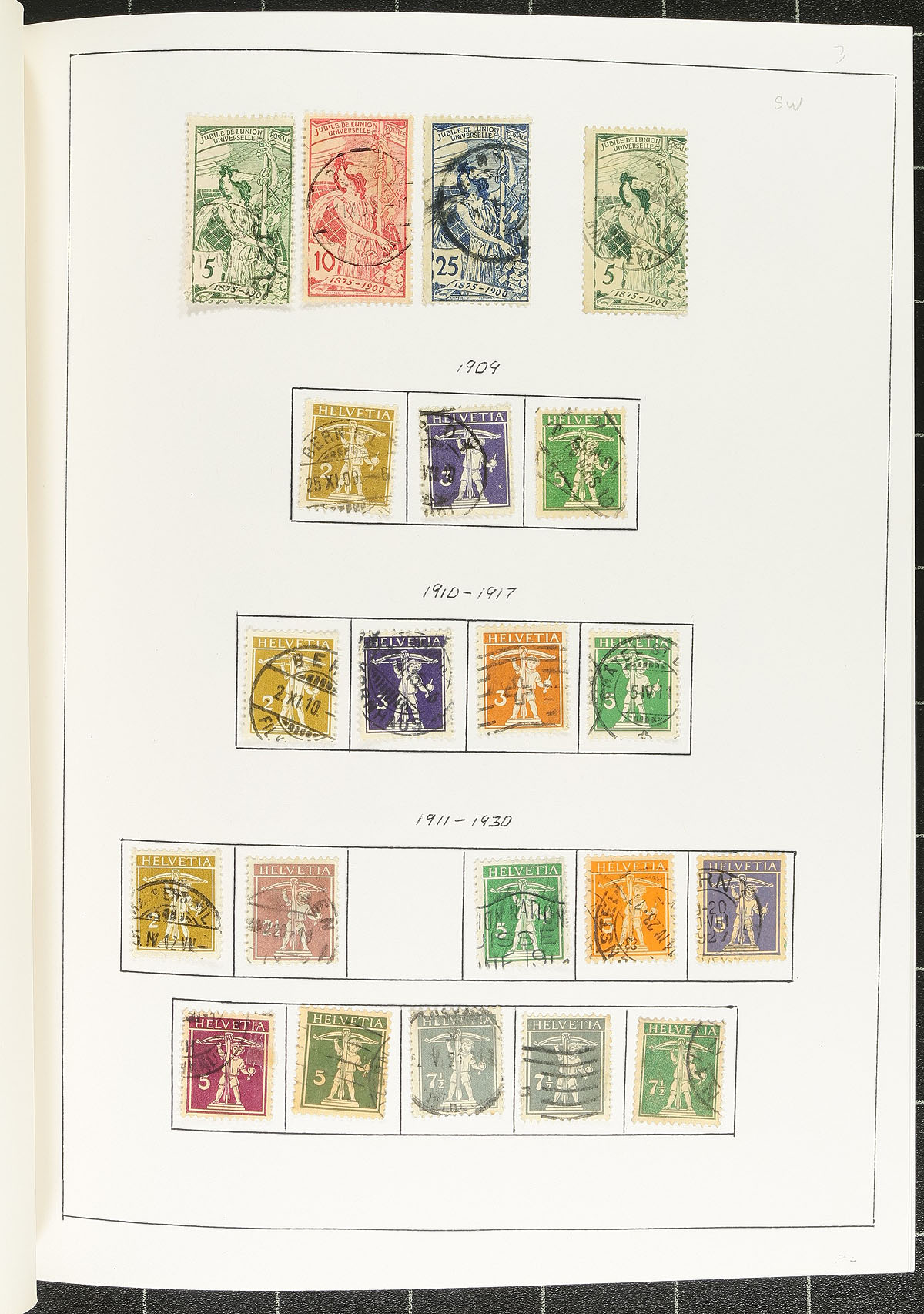 Collection of used Switzerland, 1862-1939, containing a few hundred stamps on roughly 30 homemade album pages. The collection is generally well organized, with each stamp identified by the collector, ranging from Scott #43/255, noting singles, sets, and partial sets, with a spot check indicated some material cataloguing $10 to $20 each. Owner's 2014 Scott catalogue value for the collection totals US$778.00. A nice collection with some duplication for a few issues, a faults with a few stamps, overall fine to very fine. Estimate =