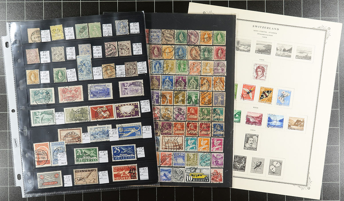Collection / accumulation of used Switzerland, 1860's-2000, with over 1,000 stamps in roughly 20 stock pages. The lot generally ranges from Scott #50/1072, noting singles, sets, partial sets, along with several used blocks. Some of the stamps have been identified, with catalogue value ranging from $15 to $20 and up each. Owner's 2016 Scott catalogue value for the lot totals US$1,880.00. Postmark interest includes cds types, including a few "socked on the nose" town cancels. A few faults with a few of the early stamps, overall fine to very fine. Estimate =