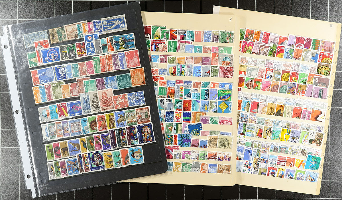 Collection / accumulation of used Switzerland, 1860's-2000, with over 1,000 stamps in roughly 20 stock pages. The lot generally ranges from Scott #50/1072, noting singles, sets, partial sets, along with several used blocks. Some of the stamps have been identified, with catalogue value ranging from $15 to $20 and up each. Owner's 2016 Scott catalogue value for the lot totals US$1,880.00. Postmark interest includes cds types, including a few "socked on the nose" town cancels. A few faults with a few of the early stamps, overall fine to very fine. Estimate =