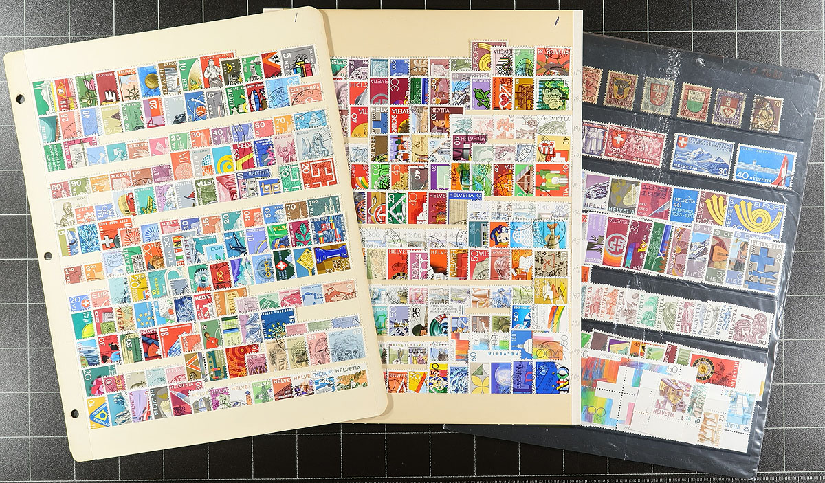Collection / accumulation of used Switzerland, 1860's-2000, with over 1,000 stamps in roughly 20 stock pages. The lot generally ranges from Scott #50/1072, noting singles, sets, partial sets, along with several used blocks. Some of the stamps have been identified, with catalogue value ranging from $15 to $20 and up each. Owner's 2016 Scott catalogue value for the lot totals US$1,880.00. Postmark interest includes cds types, including a few "socked on the nose" town cancels. A few faults with a few of the early stamps, overall fine to very fine. Estimate =