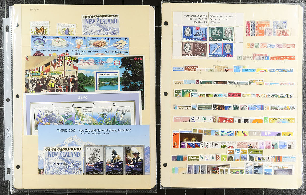 Nice accumulation of primarily never hinged New Zealand, 1916-2008, containing roughly 1,000 stamps in over 20 stock or album pages. The lot generally ranges from Scott #163/2222, containing several sets, a few souvenir sheets and booklets, along with a small selection of semi-postal issues. Owner's 2015 Scott catalogue value for the lot totals US$1,305.0, with face value alone at least a few hundred dollars. A nice clean lot for all collectors. Estimate =