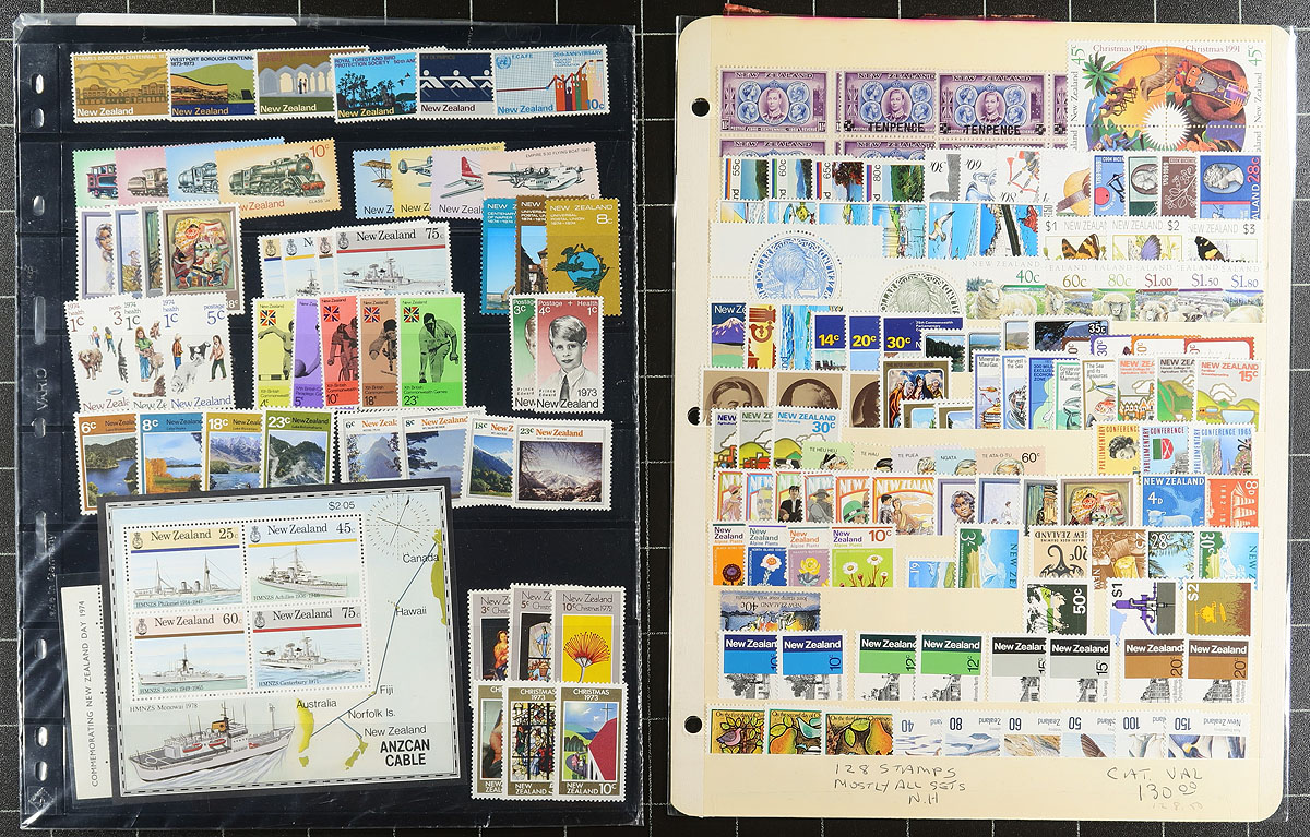 Nice accumulation of primarily never hinged New Zealand, 1916-2008, containing roughly 1,000 stamps in over 20 stock or album pages. The lot generally ranges from Scott #163/2222, containing several sets, a few souvenir sheets and booklets, along with a small selection of semi-postal issues. Owner's 2015 Scott catalogue value for the lot totals US$1,305.0, with face value alone at least a few hundred dollars. A nice clean lot for all collectors. Estimate =