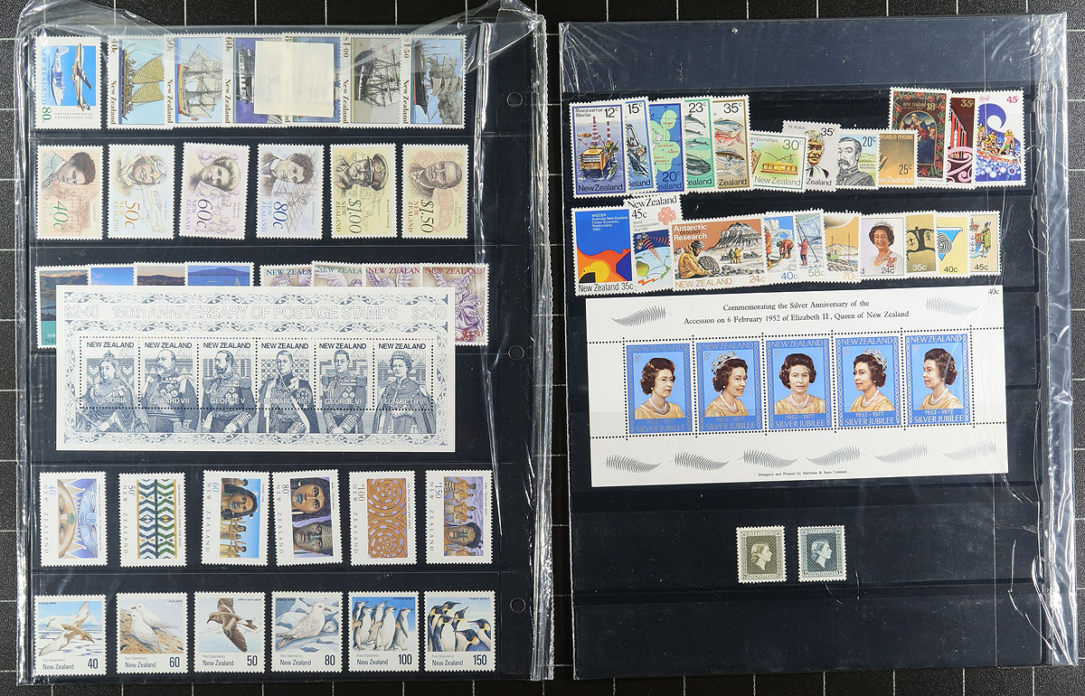 Nice accumulation of primarily never hinged New Zealand, 1916-2008, containing roughly 1,000 stamps in over 20 stock or album pages. The lot generally ranges from Scott #163/2222, containing several sets, a few souvenir sheets and booklets, along with a small selection of semi-postal issues. Owner's 2015 Scott catalogue value for the lot totals US$1,305.0, with face value alone at least a few hundred dollars. A nice clean lot for all collectors. Estimate =