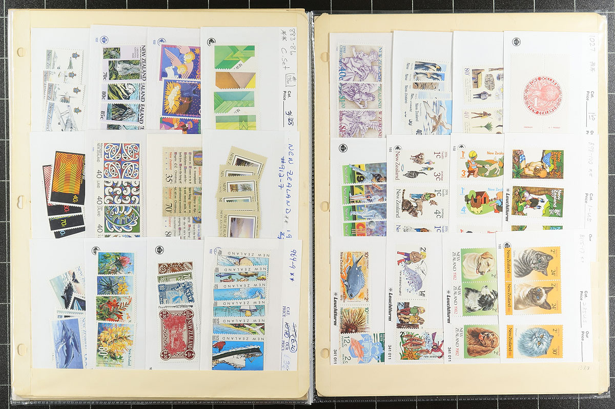 Nice accumulation of primarily never hinged New Zealand, 1916-2008, containing roughly 1,000 stamps in over 20 stock or album pages. The lot generally ranges from Scott #163/2222, containing several sets, a few souvenir sheets and booklets, along with a small selection of semi-postal issues. Owner's 2015 Scott catalogue value for the lot totals US$1,305.0, with face value alone at least a few hundred dollars. A nice clean lot for all collectors. Estimate =