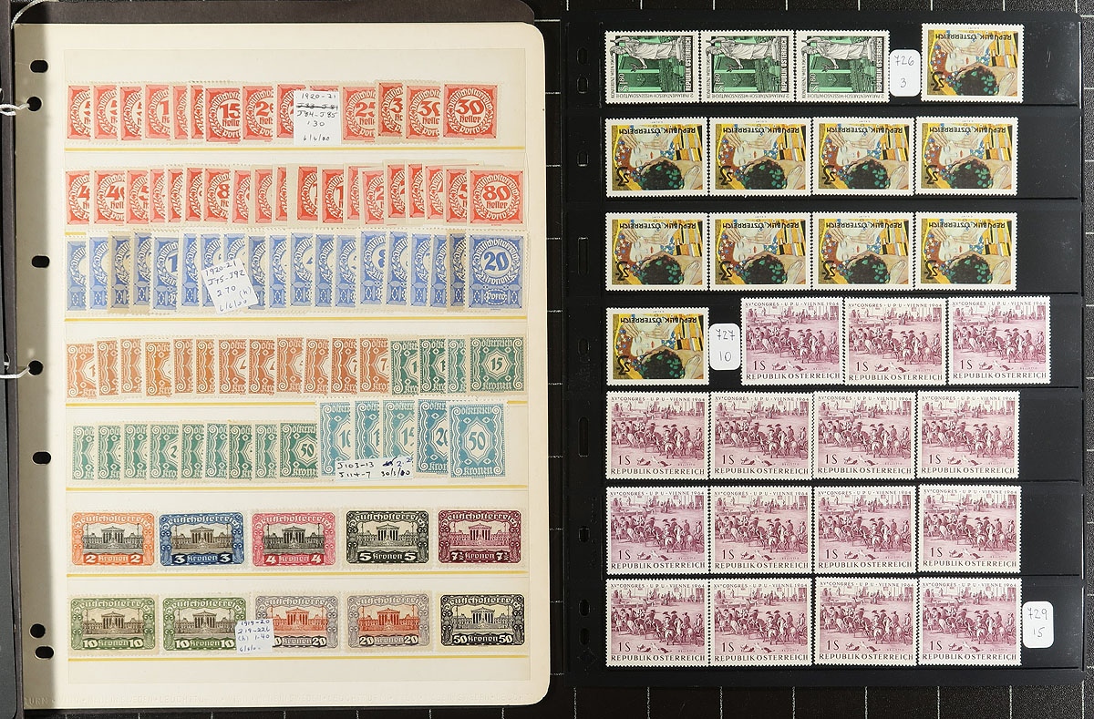 Accumulation of primarily never hinged Austria, 1908-1993, containing about 1,600 stamps in roughly 15 stock or album pages. The lot generally ranges from Scott #119a/1417, containing sets, partial sets, souvenir sheets and back of the book issues. Owner's 2019 Scott catalogue value for the lot totals US$765.00, with duplication between 5 to 10 for some issues. A clean lot for all collectors. Estimate =